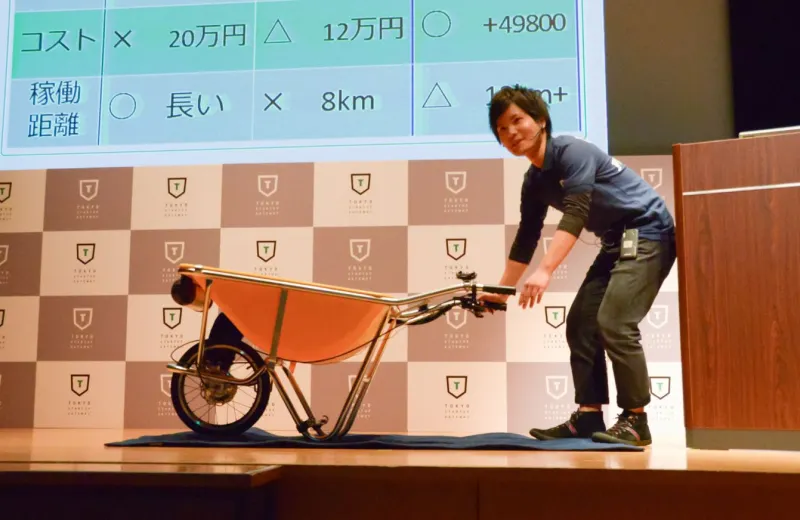 嘉数:初めから言ってるので大丈夫です(笑)。でも、審査を通過して、電動バイクも勿論完成させたんですが、最終審査の前で、これはビジネスとしては難しいと考えました。それで、TOKYO STARTUP GATEWAYのメンターの方々と話しながら、同じ方向性で何かできないかと考えて、電動ねこ車にいきつきました。それでまたギリギリで試作してファイナルまで通ったという流れですね。