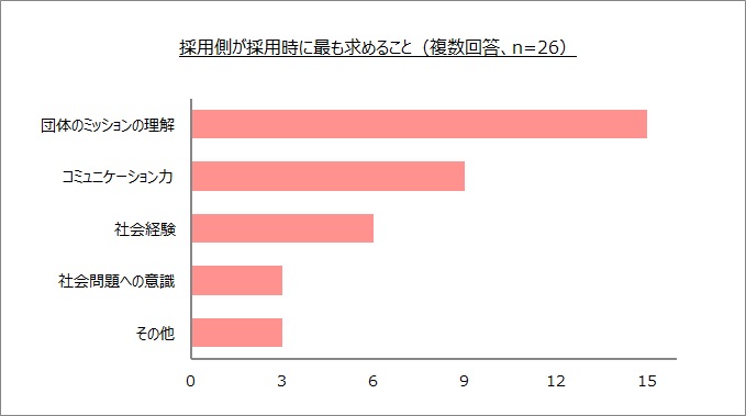 直接的ではありませんが、上記のデータからヒントを読み取ることができます。これによると、採用サイドが「採用時に最も求めること」の第一位は「団体のミッションの理解」、次に大きく間をあけて、「コミュニケーション力」と続きます。