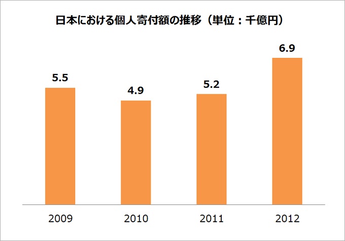 『寄付白書2013 Giving Japan 2013』日本ファンドレイジング協会、2014を参考に作成 日本の寄付市場を2020年までに10兆円にすべく活動している「日本ファンドレイジング協会」によると、日本における2012年度の個人寄付額は6,931億円。2009年からずっと5,000億円前後で推移していたなか、2011年の東日本大震災を機に一気に拡大したという。 寄付の盛り上がりはすでにはじまりつつあるのだ。