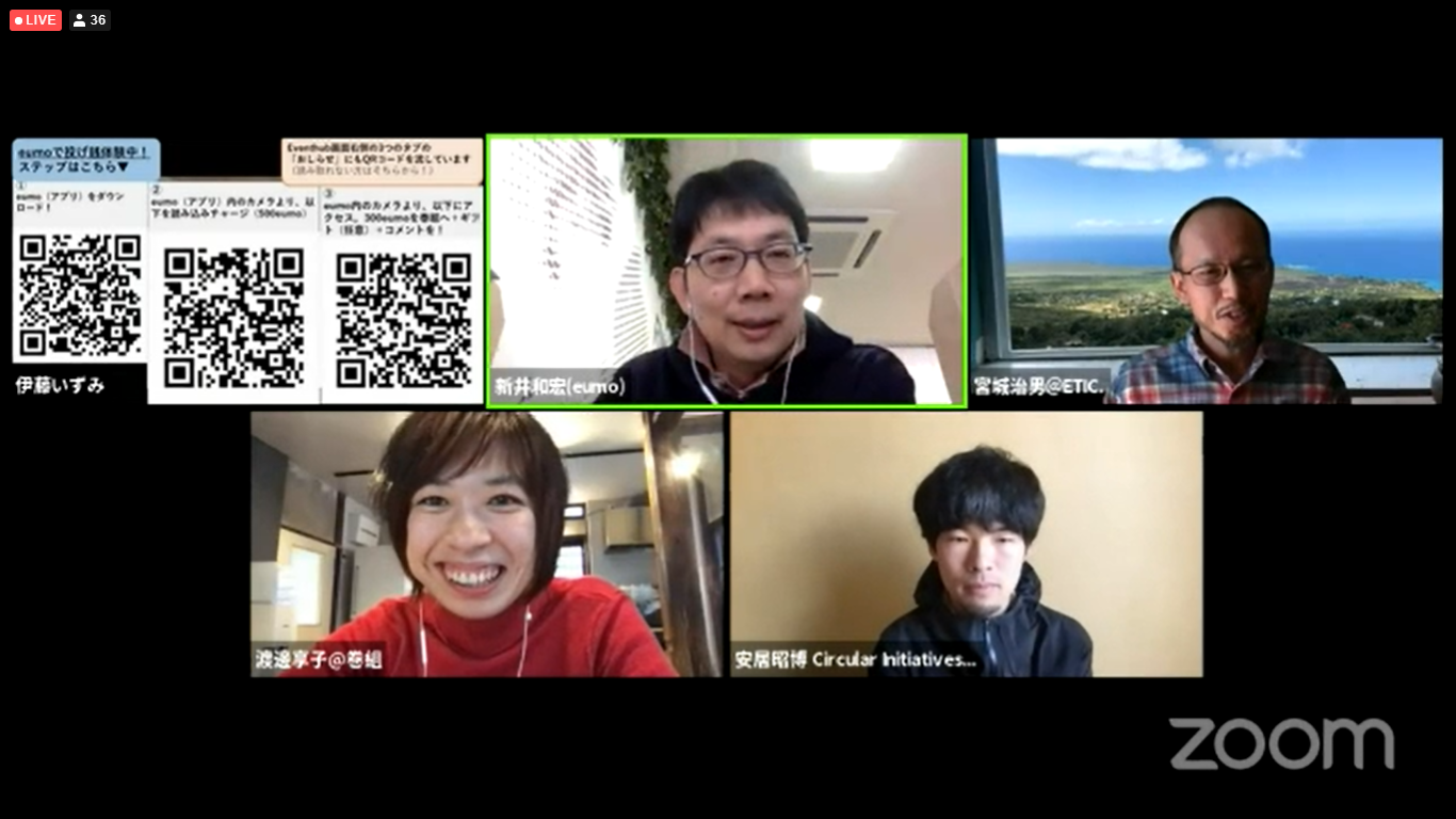 今日は、視聴者の皆さんに実際にeumoを体験していただきたいと思います。eumoアプリをスマホにダウンロードし、せっかくなので渡邊さんの巻組を応援してみましょう。今回は、私から500eumox200人分のギフトを用意しましたので、画面のQRコードを読み取ってeumoを受け取ってください。次に加盟店の中から巻組さんを選び、300eumoをお支払いしてみてください。OKを押すとギフト画面になるので、残りの200eumoを好きなところへギフトしてみましょう。そのとき一緒に応援メッセージを送ると、加盟店にリアルタイムで表示されます。ぜひ、共感でお金が循環するeumoの仕組みを楽しんでいただけたらうれしいです。
