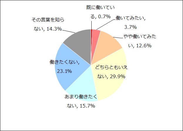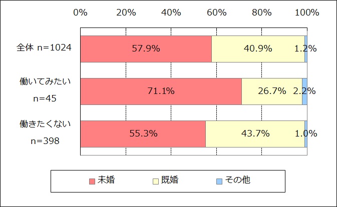 次に、「働きたい」「働きたくない」それぞれの層はどんな人たちなのか、特徴を詳しく見ていきます。なお、ここでは各層の違いをより明確に見ていくため、”働きたい層”は「すでに働いている」「働きたい」と回答した人、”働きたくない層”を「あまり働きたくない」「働きたくない」と回答した人と定義して結果を見ていきます。