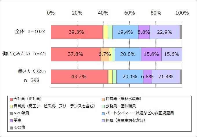 一方女性は30代前半で「働きたい」との回答が最も高いという結果になりました。性・年代別に職業を確認したところ、今回の調査対象者においては20代前半男性のうち4割が学生であったのに対し、20代前半女性においては「無職・専業主婦」が多いという特徴がありました。この職業構成も、20代前半男性においてNPO・SBへの就業意向が高くなった要因のひとつとして考えられます。