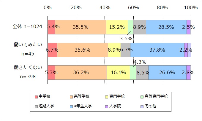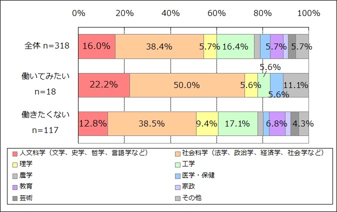 “働いてみたい層”は全体と比較して未婚者、職業は学生や自営業、そして学歴は大卒者が多い傾向が見受けられました。また、サンプル数は少ないものの、専攻はいわゆる文系が多いという傾向も見られました。次回の記事にて掲載予定ですが、”働いてみたい層”は「学生時代の授業や研究でNPO・SBでや社会問題を取り扱った」経験をしている割合が多いというデータもあり、大学時代の経験がキーとなる可能性が考えられます。