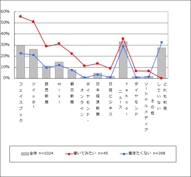 “働きたい”層は、facebookやtwitterの利用率が50%以上と非常に高いのが特徴的です。また、新聞やインターネットのニュースサイトの接触率も高い傾向にありました。普段から情報感度の高い人物像が浮かび上がります。