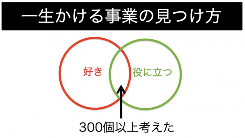 TSGに応募してからホトカミを始めるまでは、アイデアがまとまらない人の典型みたいな感じでしたね。スサノヲ終了後、同じくエティックが運営する20代前半のイノベーター向けの「MAKERS UNIVERSITY(以下MU)」というプログラムにも1期生として参加したんですが、MUのメンターだったピクスタ株式会社の古俣大介さんに教えていただいた、「人生を賭けられる事業の見つけ方」が非常に参考になりました。2ヶ月近く事業アイデアを書き出し続け、300近く考えた中からたどり着いたのが今の事業です。「好きな事」×「役に立つか」で考えるなど「一生かける事業の見つけ方」として僕なりのアレンジで紹介していますので、よかったら読んでみてください。