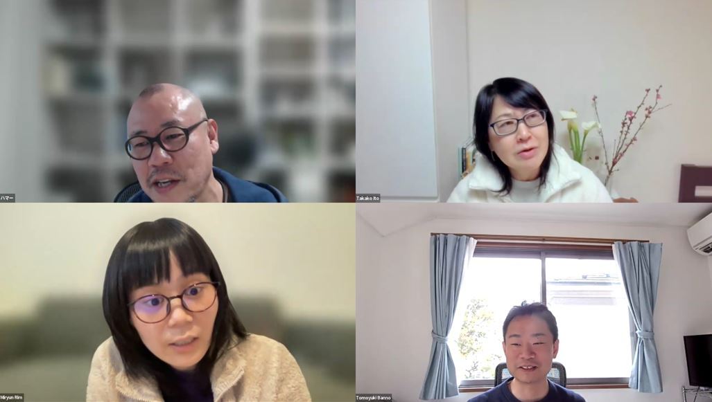 社会課題解決の仕事とコーチングについて語り合う様子。写真左上から時計回りに長浜さん、伊藤さん、番野、林