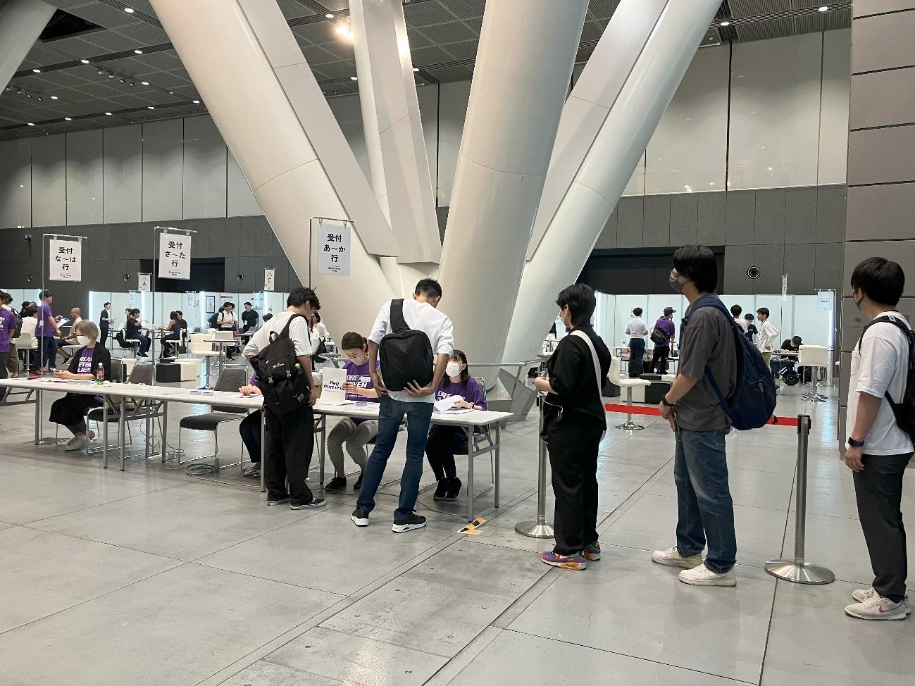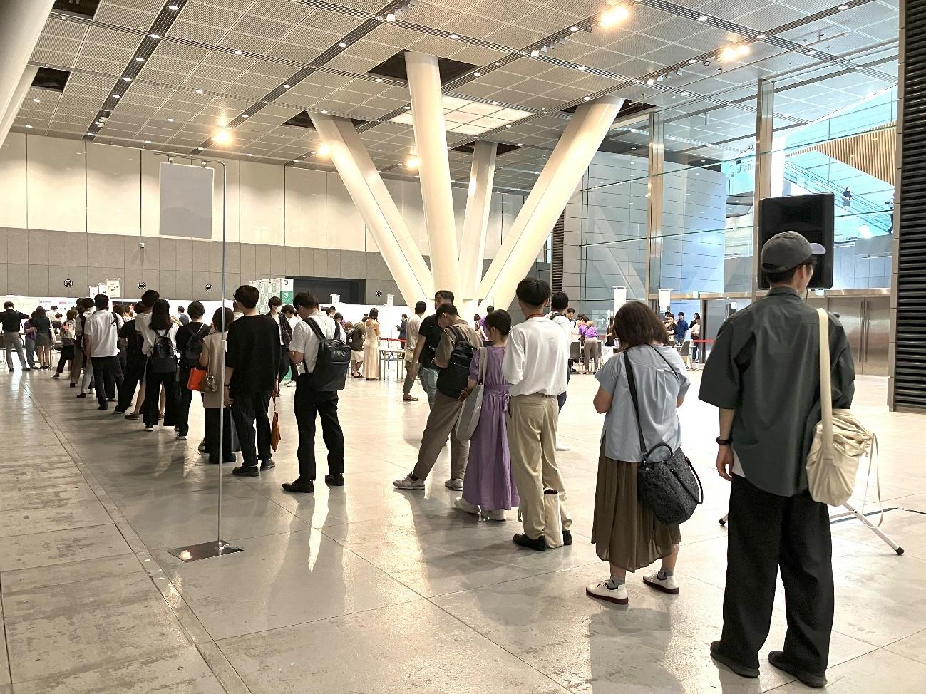 会場の外には入場を待つ人の長い列ができていた。パープルのスタッフTシャツを来ているのは(右寄り中央)、