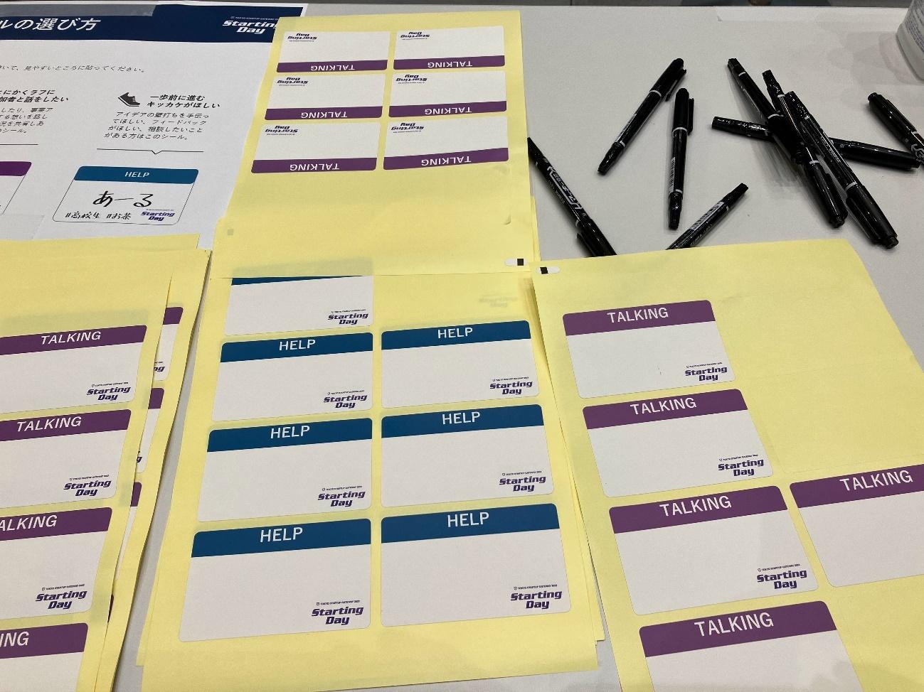 参加者たちはそれぞれ自分の名前などを書き込み、胸に貼り、出会えた人と話をしていた