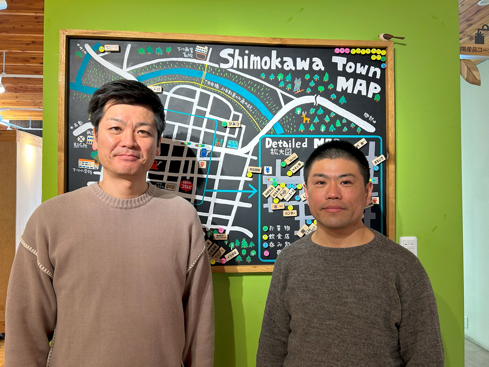 下川町役場総務企画課長の山本敏夫さん(左)とNPO法人森の生活代表理事の麻生翼さん(右)