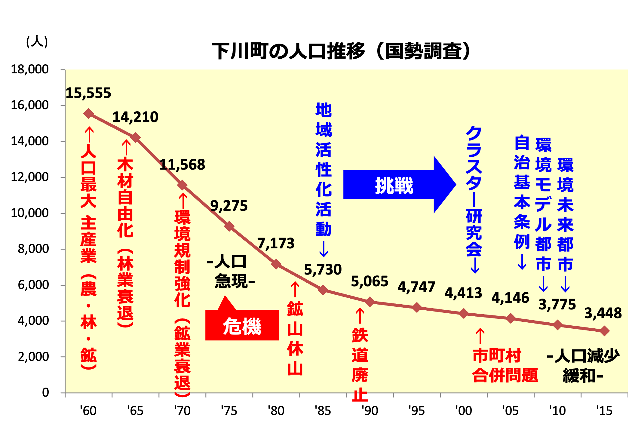 たしかに、これだけの取組が内外に知られ、若い移住者も増えて一時は転入超過を達成した下川町でも、人口の減少そのものは止まっていない。1960年代初の15,000人超をピークに40年間で4,400人まで急減。その後は様々な施策が奏功し減り方が鈍化したとはいえ、直近では2018年の3,300人から5年間で1割減っている。