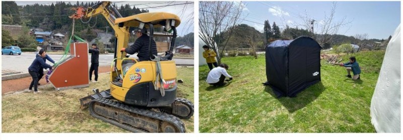 アイデアが形になったことの一つが、薪ボイラーを使って湯を沸かすお風呂の設置(上の写真左)です。ボランティアスタッフや被災者の方が入れるお風呂で、5月に完成予定です。