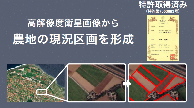 肥料を削減するためには土壌分析をして土の状況を把握する必要がありますが、費用やコストがかかってしまいます。 そこでサグリでは、AIによる衛生解析を用いて、農家さんは自分の農地だけ登録していただければ自動で解析が始まり、現況を把握することができる仕組みを整えました。 世界中の農地に届けるためには区画が必要だったので、区画も衛星から作る技術を構築しました。