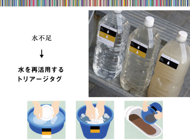 避難所には多くの人が集まっていますが、専門家がいるわけではありません。その中でいかに迅速かつ的確に物事を決断するかが避難所生活では重要です。例えば、水が不足している状況で「飲める」、「洗い物には使える」、「トイレを流すのには使える」といったことがひと目でわかるトリアージタグがあれば、水をどのように再活用できそうか、誰でもすぐに判断することができます。