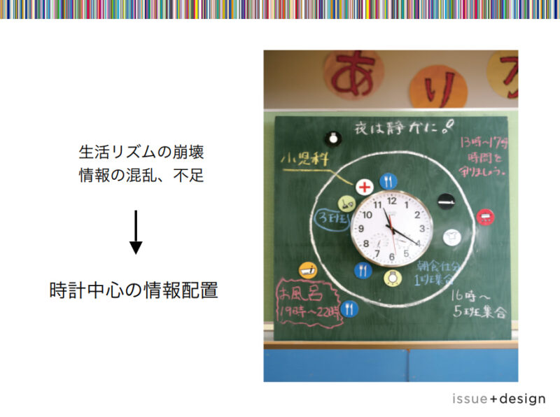 避難所では普段担っていた社会的役割が機能しなくなり、それどころか朝昼夜という時間感覚さえ失ってしまいがちです。混沌とした状態から抜け出し、小さくても自分にできることを自発的に進められるよう、1歩次のステップを見せることができるのもデザインの力です。時計を中心として情報を配置するだけでも、今何をすべきかがぐっとわかりやすくなります。