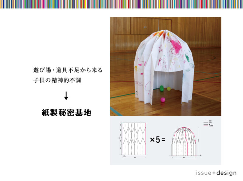 子ども用の紙製秘密基地は、避難所でも簡単に組み立てることができ、遊び場の優先順位が下がってしまう環境下でも、子どもが安心して遊べる場所を確保することができます。