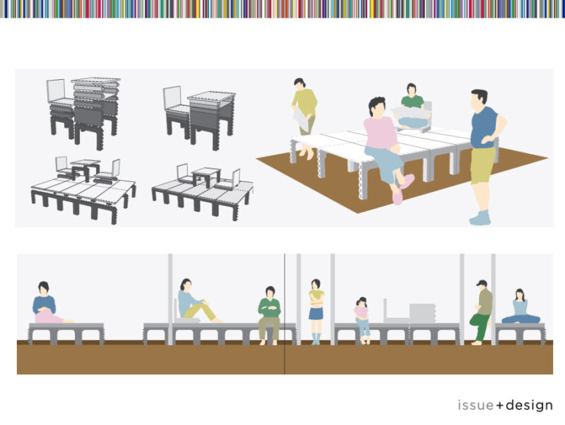 通路との境界がない床上での生活(非日常)から、避難所で簡易的に使える組み立て式のテーブルといすを使うことで生活空間の高さを上げ、日常に近づけるというアイデアが好例です。