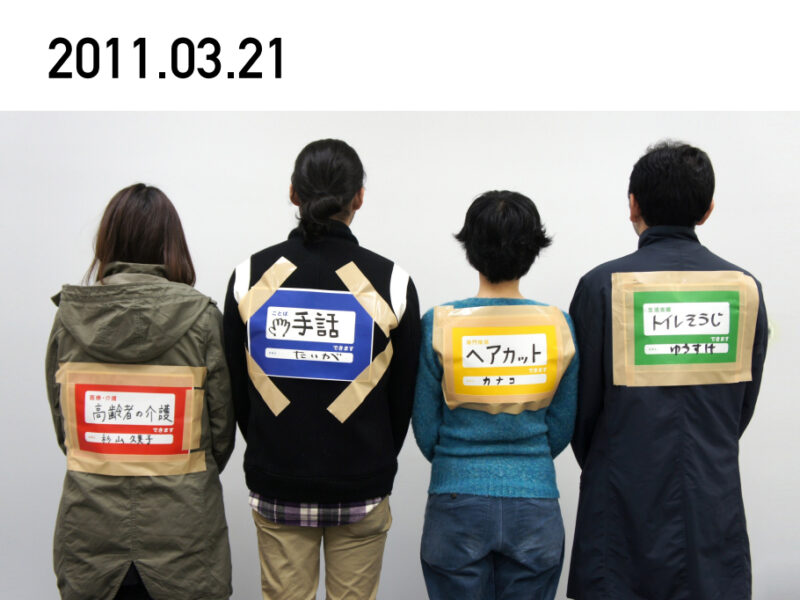 コミュニケーションが上手な人は自分からどんどん地域に入り込んで活動することができますが、何ができるのかうまく伝えられず、思うような活動ができなかったボランティアも多くいました。そこで、何ができるかを書いた名刺サイズの紙をぶらさげておくという、スキル共有IDカードというアイデアが生まれます。2011年の東日本大震災の際、これをブラッシュアップして現場で活用されたのが、「できますゼッケン」です。