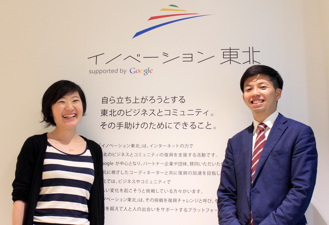 グーグル株式会社 防災・復興プロジェクトプログラムマネージャーの松岡朝美さん(左)と、 サポーターの上原航輔さん(右)
