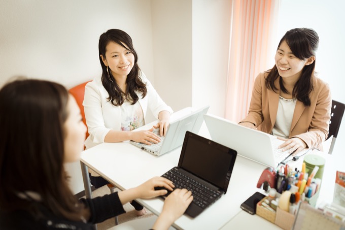 仕事と育児の両立を学べる“家庭内インターンシップ”で起業した堀江さん(中央)と「スリール」スタッフの打ち合わせ