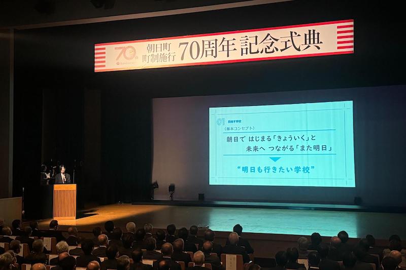 山形県朝日町は2024年11月1日、町制施行70周年を迎え、その記念式典で新しい学校名の発表とコンセプト解説が行われた
