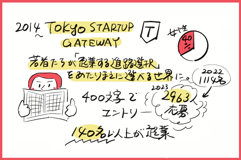 TSGは10年前、2014年から始まりました。東京都主催のビジネスコンテスト事業なのですが、自分の思いの丈を綴った400文字のエッセイからエントリーできて、半年間ほどのプロセスの中で起業する事例も生まれるよう意図し、起業の裾野を広げています。