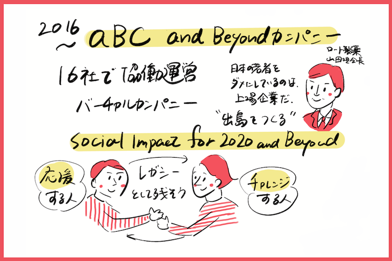 そこから、利益の追求を前提とした組織運営のなかでも失敗できる環境を、一社ではなく、まるで“出島”のように人々が共有できる場としてつくってみようと2016年に生まれたのが、「aBC」の前身となる「Social Impact for 2020 and Beyond イニシアティブ」です。