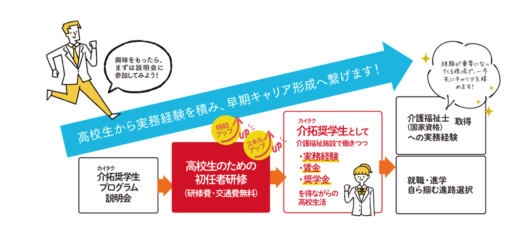 日本でもアプレンティスシップを取り入れる企業が増えています。例えば愛知県で展開する「介拓(かいたく)奨学生プログラム」は、介護福祉施設で働けて、無料で国家資格「介護福祉士」を取得できるアルバイトです。働きながら学ぶ機会を働く現場で提供しています。介護福祉施設ではもともと、人手不足という問題を抱えていました。一方、高校生は不登校だったり進学資金がなかったりという問題を抱えています。このプログラムは、両者の抱える課題を解決する仕組みになっているのです。