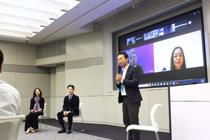 当日はリアルでの参加者に加え、オンラインで150名以上もの社員が参加。冒頭挨拶では、NECコーポレートコミュニケーション部シニアディレクターの岡部一志さんから、「会場には10年以上関係を続けてきた社会起業家の方々がいらしていて、またここ数年『NEC社会起業塾』を卒業したという方との出会いが増えている。長く、現在に至るまでこうした社会価値創造の取り組みが継続しているのはとても誇らしいこと」という言葉が語られ、これまで積み上げてきた価値を見つめ直し23年目以降の共創を考える機会として本会はスタートしました。