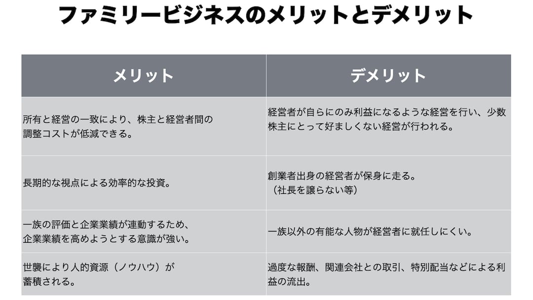 家族経営のメリットは長期的な視点で経営できること。デメリットは大企業経営とほぼ同じ