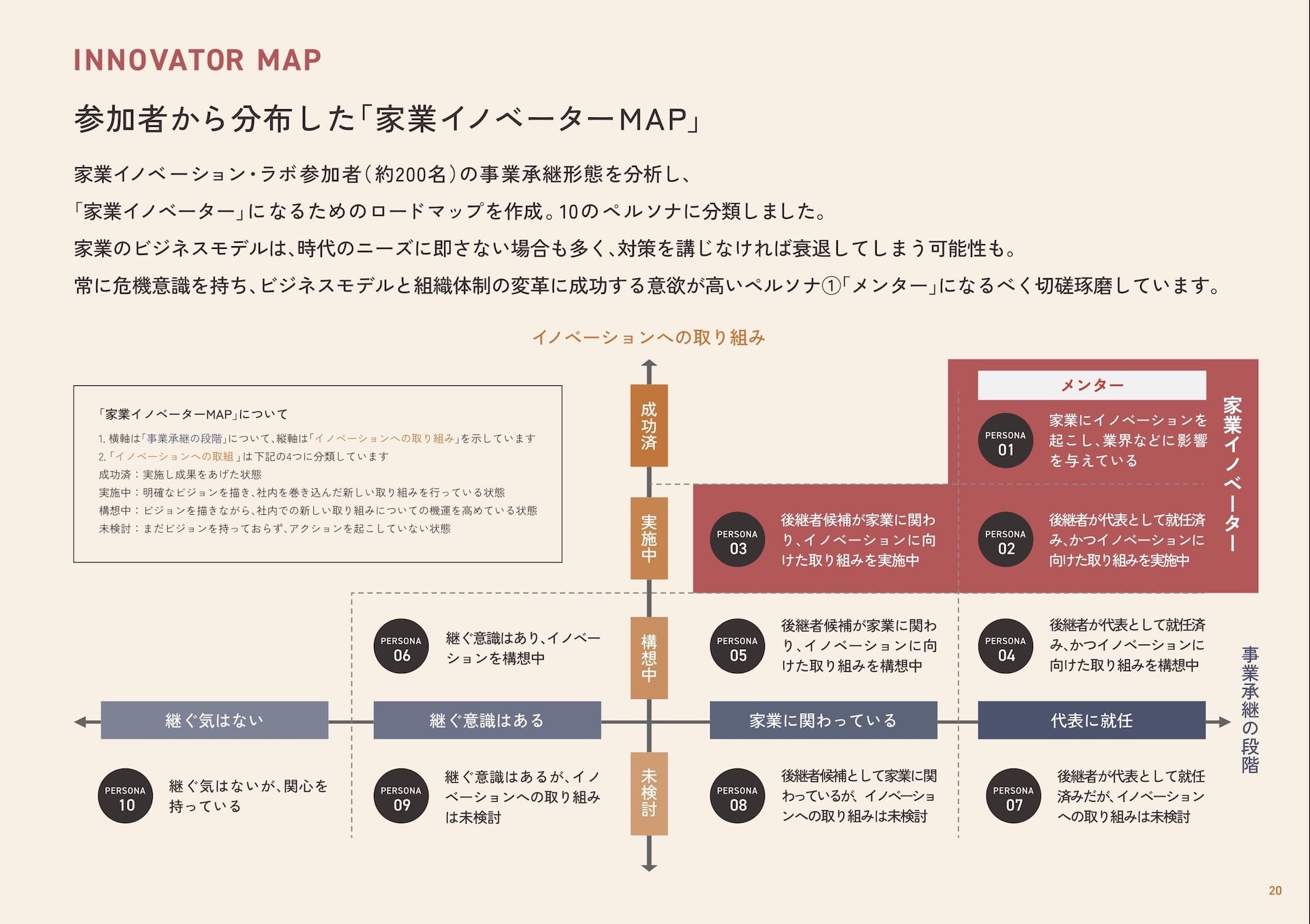 事業承継の段階や、イノベーションへの取組に応じて10のペルソナを設定していますが、特に仕事として家業に関わりながらイノベーションを起こそうと七転八倒しているような人(ペルソナ4、5、8)を対象に、赤枠の「家業イノベーター」(ペルソナ1、2、3)と言える存在になれるようサポートしています。