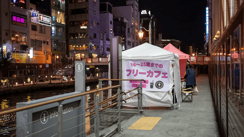 今井 : みなさんに質問してもいいでしょうか。僕たちは「グリ下」と呼ばれる、大阪・ミナミの繁華街にあるグリコの看板下周辺に集まる若者への支援を行っています。家出をした子たちが集まって居場所にしているようなエリアなんですが、そこに週1でテントを立ててカフェを開催しています。カフェには夜寒い中、1日40~50人が集まります。