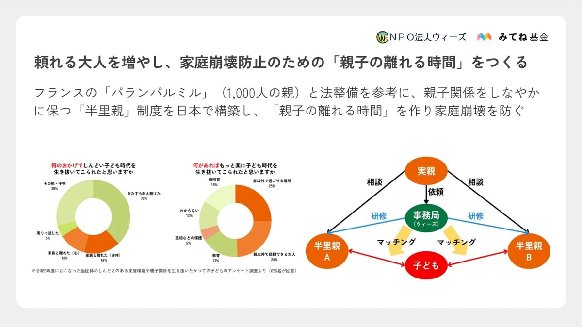 ・「NPO法人ウィーズ」が、家庭環境で悩む子どもと、親以外の頼れる大人をつなぐことで、親も子どもも孤立しない、豊かな子育て環境をつくるプロジェクトに挑戦中。