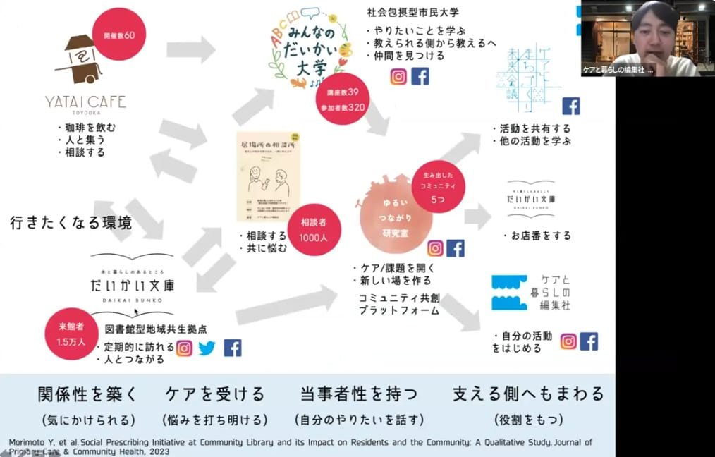 図書館、居場所、相談所など、いろいろな機能が地域にできたことでソーシャルサポートを受けたり、相互信頼やエンパワーメントが起こったりと変化が現れました。さらには、世代を超えたつながりも生まれています。今後も、ケアと暮らしの編集社の活動を、地域の人同士がつながる多機能拠点として発展していきたいです。