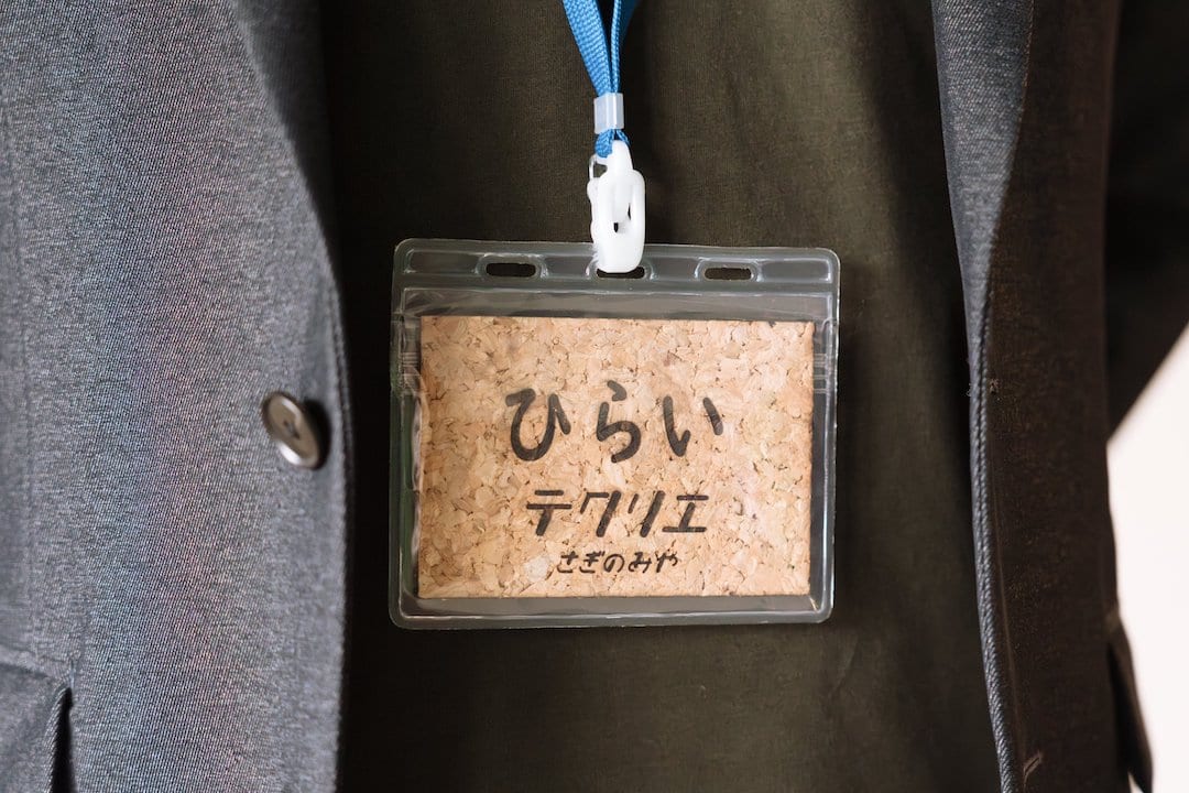 「高校生に作ってもらったんです」と平井さんが見せてくれたコルクのカッコいい名札。テクリエさぎのみやに通う子どもがレーザーカッターで作ったものだそう