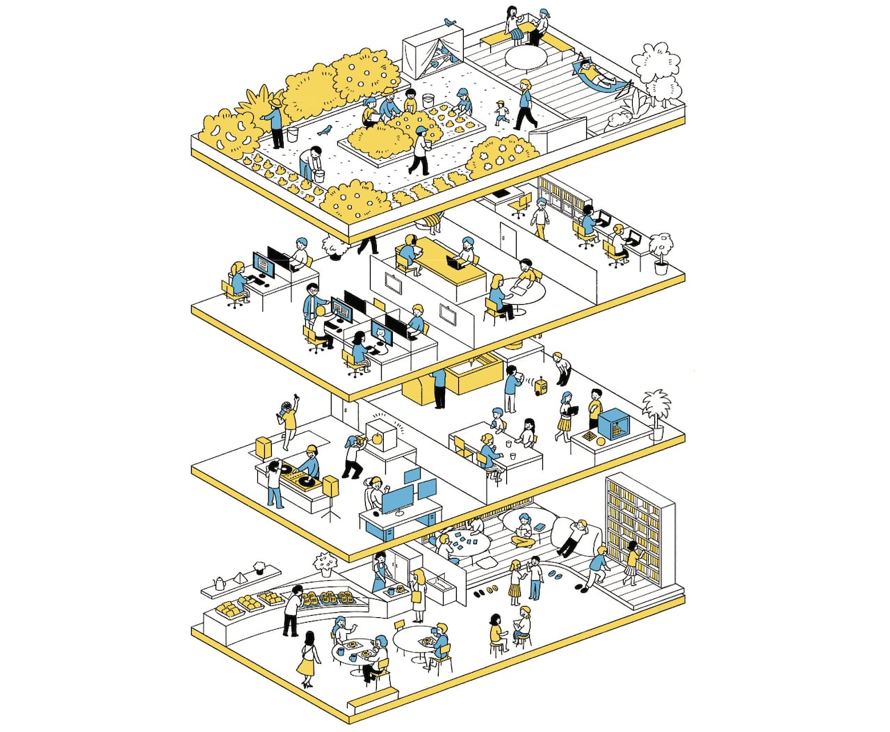 最寄り駅から徒歩1分。1階は、明るい日差しがたっぷり入るワッフルカフェで、奥には赤ちゃん連れの親子でもゆっくり過ごせるオープンなスペースがあります。2階と3階は、最新のデジタル機器が並び、中高生にとって学校や家庭以外の「秘密基地」。