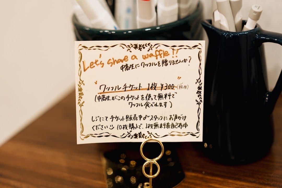 ワッフルチケット(1個330円)を買えば、中高生たちにワッフル1個分を無料プレゼントできる仕組みに