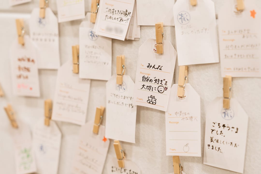 ワッフルチケットに書かれた大人たちのメッセージの裏に、「おいしかったです」と中高生たちが返事も