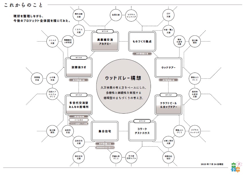久万高原町役場の伊藤さんも、ゆりラボと連携した「ウッドバレー構想」の実現に期待を寄せています。「ウッドバレー構想」とは、久万高原町の伝統産業である林業を中心に置き、多様性と継続性のある循環型のまちづくりを目指すものです。すでにある程度形になっている、四角で囲まれた事業の間をつなぐことで、丸枠で囲んだ活動の担い手の掘り起こしや呼び込みに取り組んでいきたいと考えているそうです。
