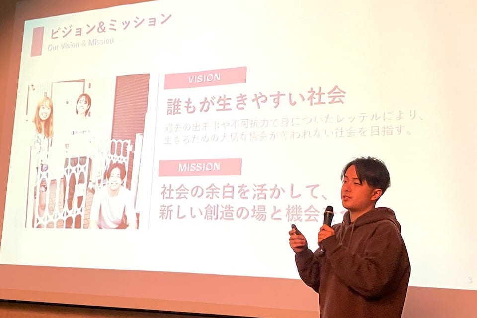 僕は、6歳の時に父を亡くし、その際、遺族年金をはじめ公的なセーフティネットに助けられながら育ってきた経緯があります。しかし、一方で、本来受けられるはずの制度につながれない人、そもそも制度が受けられない地域があることに問題意識を持ち、大学2年のときに生きづらさを抱えた人たちや現場の研究をしながら、合同会社Renovate Japanを設立しました。ビジョンは、「誰もが生きやすい社会をつくる」です。