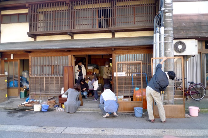 その家は物がたくさん眠っていて、どうしようもないような状態でした。でも、状態がしっかりした町家だと、物をなくすだけでけっこう住めるんじゃないかと思ってやってみました。 雑巾持参で掃除をして、家にある物で欲しい物があれば持ち帰ってもらうので捨てる物も減って、とにかくきれいになります。多いときは、200人以上の方が全国からきてくれて、みんなの想いもあるし、みんなで掃除をしているとどんどんきれいに美しくなっていくので、「住めるかな?」という気持ちになってくるんです。
