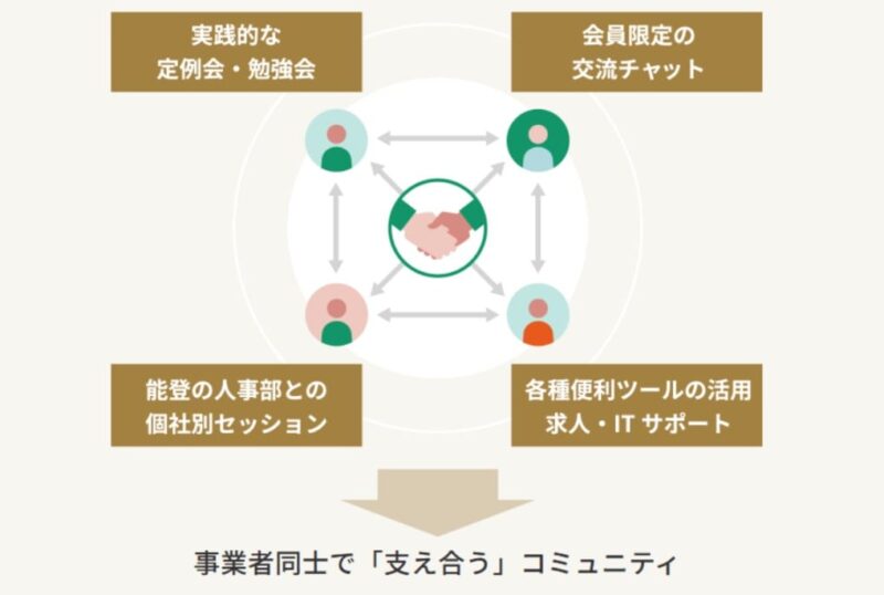経営者同士が学び合って成長し続けることで各企業の魅力が高まり、能登地方全体の採用力も上がっていくという仮説の下に立ち上げたコミュニティが、「能登の経営力向上委員会」です。月額会員制サービスという形で、月に1回程度の定例会や勉強会、会員同士で自社の困りごとを相談し合える交流チャット、弊社のコーディネーターが経営課題の解決に向けて伴走する個別セッションなどを提供しています。