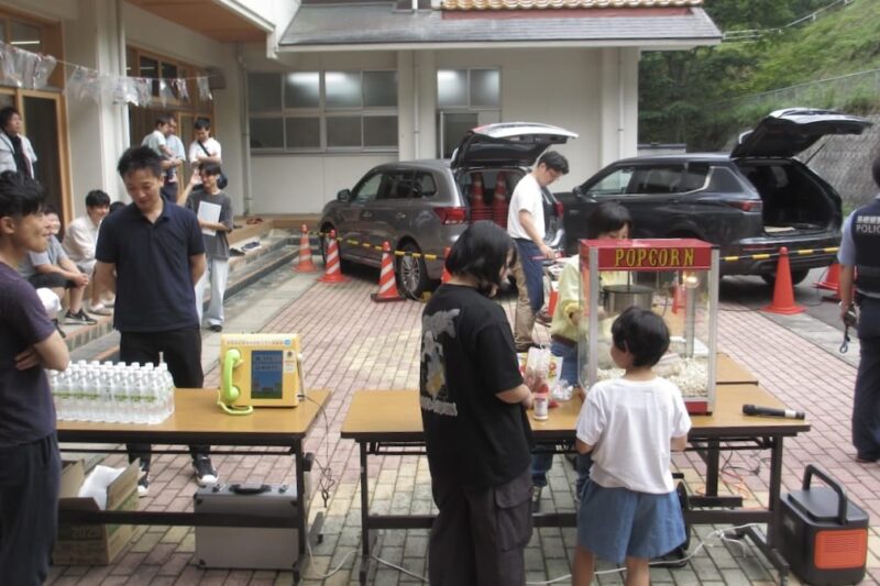 このお料理は住民の方にも好評で、その後マーケットでは魚肉ソーセージが売り切れました(笑)。屋外ではEV車まで展示されていて、そこから電気をひっぱってポップコーンを作ったりもしました。