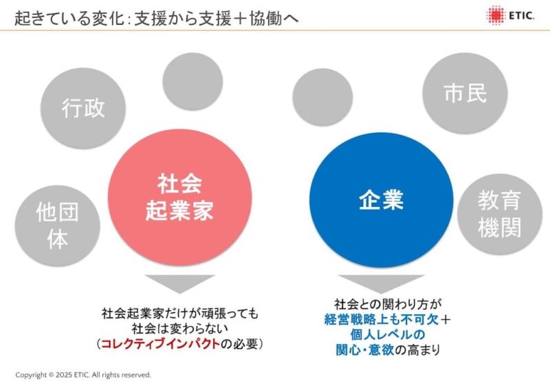 この新しい挑戦の背景には、24年間の奮闘の先に生まれた「社会起業家が頑張るだけでは社会は変わらない」という深い実感や、営利企業も経営戦略上社会と関わる必然性が生まれるようになった時代の変化、日本社会における個人レベルでの社会課題への関心・意欲の高まりがあります。