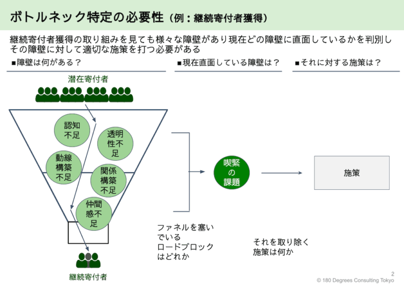 例えば、寄付を増やすためにクラウドファンディングを実施したり、新しい広報施策に取り組んだりする団体は多くあります。しかし、その施策がうまくいかないと、別の施策を試すという形で取り組みが続いていきます。