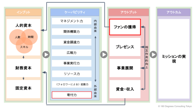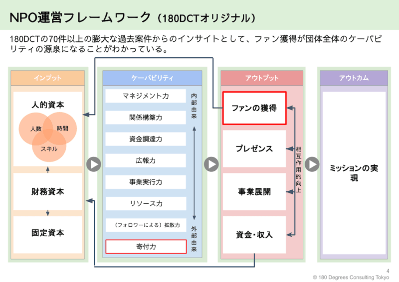 今回の分析に限らず、180 Degrees Consulting Tokyo(180DCT)はこれまで多くのNPOを支援する中で、成功している団体に共通する特徴を見出してきました。それは、団体の活動を支える多くの資源が「ファン」の存在から生まれているという点です。