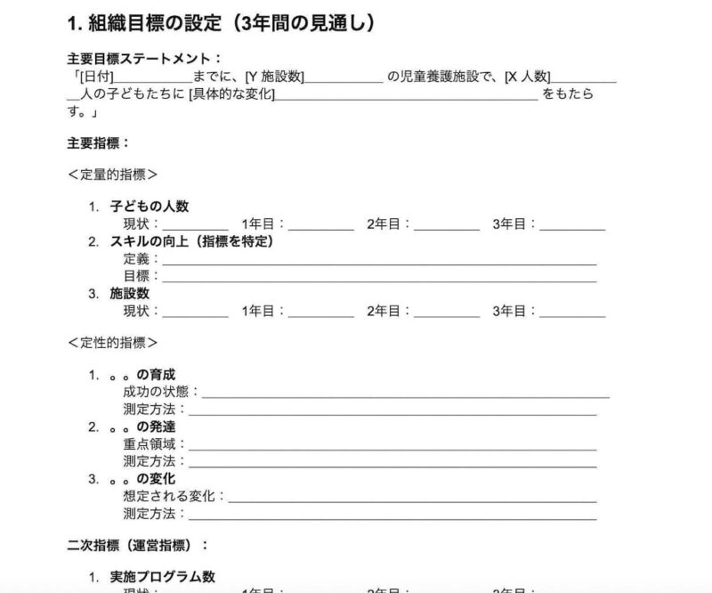こうした状況を防ぐためには、組織の目標を具体的な言葉と数値で整理することが重要です。整理する際は、以下のような組織目標設定のワークシートを活用することがおすすめです。