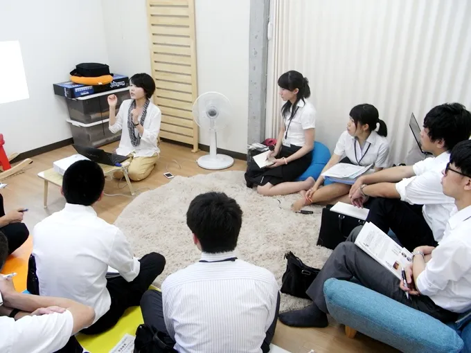 「自閉症という言葉を聞いたことのある人は、どれくらいいますか?」共同代表の竹内弓乃さんが新人官僚のみなさんに問いかけると、ADDSの教室の床に座る参加者のほとんどの手があがりました。