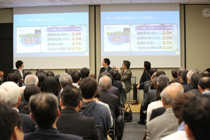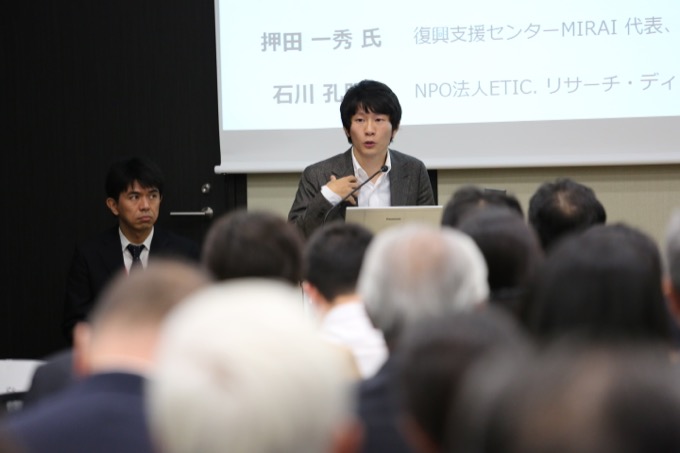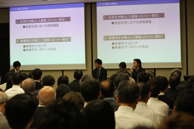 まずはETIC.リサーチ・ディレクターの石川孔明が「震災復興への支援というものは、『思い』から始まったと思いますが、最近では『データ』にもとづいて行なおう、ということが言われるようになりました」とこのSessionの背景を説明し、現場で課題に取り組む3人を紹介しました。 2 NPO法人アスヘノキボウ代表理事の小松洋介氏は、2013年4月、宮城県の女川町でまちづくり、産業活性に取り組む同NPOを設立し、創業支援や移住促進、人材育成、学生インターンなどの活動を展開し、その拠点として「女川フューチャーセンターCamass」をつくりました。その過程で、ハリケーン・カトリーナの被害を受けたニューオリンズを視察する機会などもあり、「大事なのはデータだ」と思うようになったといいます。 3 「地域にヒアリングしたうえで、国や街のデータを加工しました。また、データをまとめ、使っていくプロジェクトをどのように運営していくか、意見交換していきました」と小松氏は振り返ります。そうして同NPOが「住民の方や事業者の方に使っていただくために」まとめたのが『女川の未来を考えるデータブック』という冊子です。この冊子は「人から、考えてみる」、「お金から、考えてみる」、「仕事から、考えてみる」、「暮らしから、考えてみる」という4つのパートから構成されており、女川町の「ヒト・カネ・モノ・情報」についての数値データがわかりやすくまとめられています。 「たとえば『人が地域で金を使わないというのは本当か?』とか、『仕事があれば、人が来てくれるのか?』とか、みなさんが気にしていることがわかるようにデータをまとめていきました」と小松氏は説明します。この冊子を使った勉強会「フューチャーセッション」も、フューチャーセンターで開催されているとのこと。 4 早稲田大学災害復興医療人類学研究所所長の辻内琢也氏は、岩手や宮城、福島の仮設住宅に住む1万人を対象にしたアンケート調査を実施し、その結果がNHKの番組「震災4年 被災者1万人の声」として取り上げられたことを紹介しました。 5 この大規模なアンケートでは、東日本大震災では阪神・淡路大震災と比べて仮設住宅の入居者数の減少がずっと遅いこと、年収200万円未満の世帯は震災前には22%だったが震災後には38%に増えたこと、持病が悪化した人が35%、新たな病気にかかった人が40%、抑うつ状態にある人が55%いること、などが明らかになりました。 辻内氏はこうしたデータを分析した結論として、「社会経済の復興が心の復興をもたらし、それが人間の復興をもたらすのだと思います」と述べました。 6 復興支援センターMIRAIの押田一秀氏は、福島県相馬市で復興関連事業の企画制作や産業創出のサポートをしていくなかでデータの重要性を認識し、住民を対象として「仮設住宅における実態調査」を、事業者を対象として「事業所マッピング」や「事業所データベース作成」を実施したことを説明しました。 7 住民を対象とした調査においては、リヤカーを使って市内の仮設住宅1500戸に食品や生活用品の販売を実施すると同時に、入居状況の確認や困りごとの調査を行いました。その調査結果を、毎月、市に報告しているとのことです。また、センターに「生活相談窓口」を設置し、相談に応じてきたところ、「住民からの相談内容は、最初は心の問題などだったのですが、2013年から2014年にかけて、仕事再開や助成金などに移り変わりました」と押田氏は説明します。