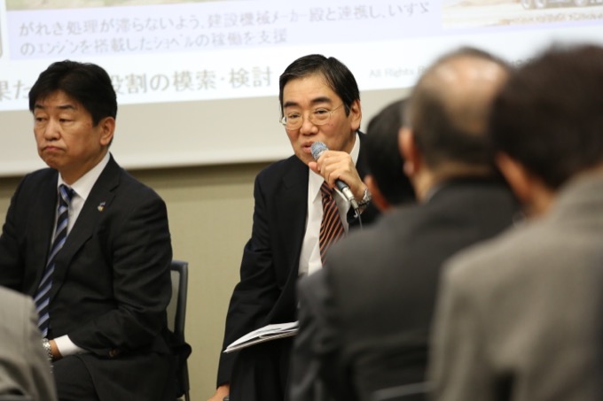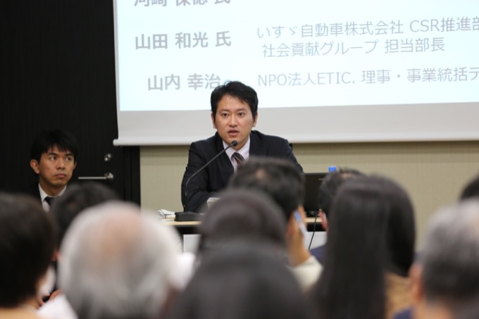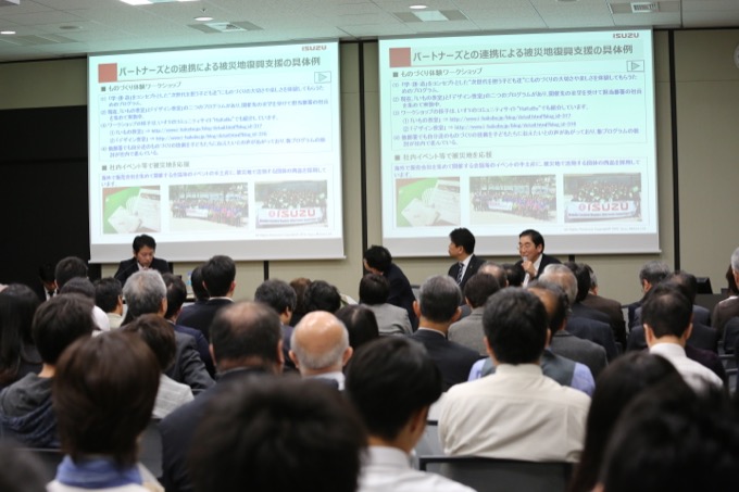 いすゞ自動車株式会社CSR推進部社会貢献グループ担当部長の山田和光氏が説明を始める前に、ETIC.の山内が東北を支えていく現地のリーダーたちを企業が支援し、地域の復興を支えることを目指す企業コンソーシアム「みちのく復興事業パートナーズ」の概略を説明しました。 5 山田氏は「いすゞ自動車は『みちのく復興事業パートナーズ』の7番目のパートナーとして参加しました。社会貢献の経験が浅い会社であります」と謙虚に話し始めたものの、震災発生直後から自衛隊や消防の災害支援車両や物資運搬車両などの点検・修理・部品供給に取り組み、また、運行情報システム「みまもりくん」を搭載した車両のデータを集約し、被災地域のトラック運行実績情報マップを提供してきたといいます。「『クルマを止めない』ということをこころがけてきました」と山田氏。 6 「復興期に入ったころ、その段階ではなかなかニーズが見えていなかったのですが、2013年3月に『みちのく復興事業パートナーズ』のシンポジウムに参加したことでわれわれに転機が訪れ、同パートナーズに正式に参加することになりました」。同社は、被災地の子どもたちにものづくりを知ってほしいと考え、南相馬市や女川町など現地のNPOなどと協力して、「ものづくり体験ワークショップ」(いもの教室とデザイン教室)をこれまでに12回開催しました。