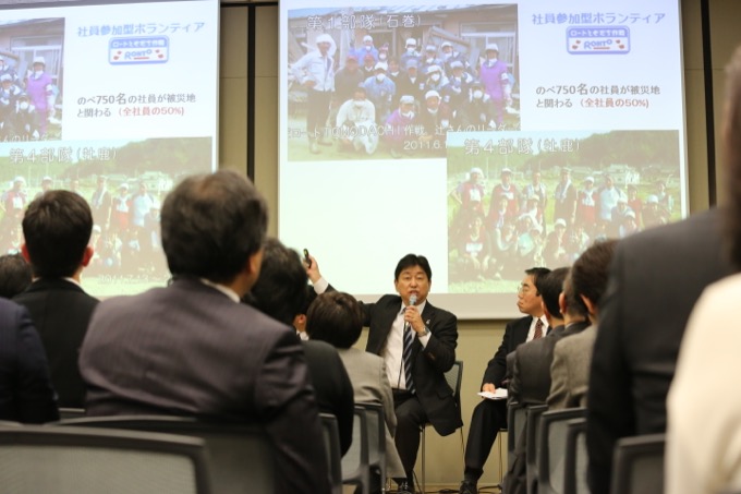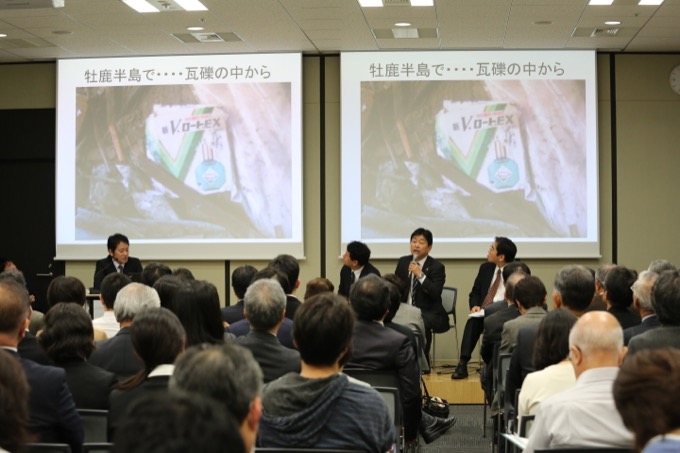ロート製薬株式会社の広報・CSV推進部部長の河崎保徳氏は、大阪に本社を置く同社が震災復興に取り込んだことの原点として「阪神・淡路大震災の経験」があることを確認しました。 3 「最初は、がれきとの戦いでした」。バスを出して、全社員の半分に当たるのべ750人がボランティアに参加しました。牡鹿半島では、被災した家を掃除していたメンバーが、がれきの中で同社の主力製品「新V・ロートEX」を見つけて涙が止まらなかったといいます。